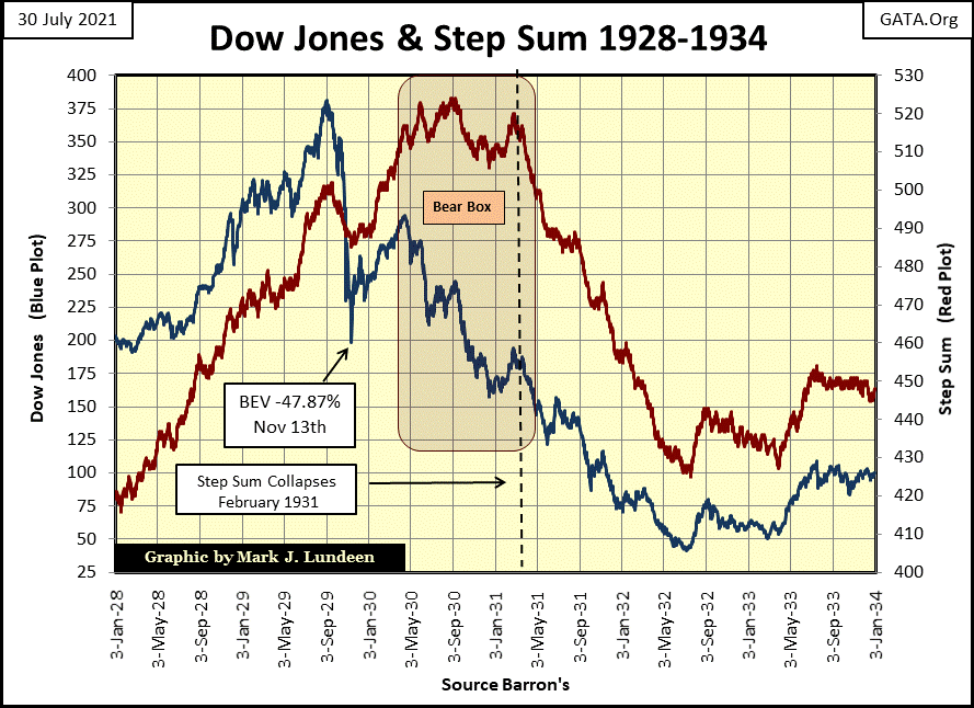 Looking at the Dow Jones and its step sum during the Great Depression Crash is very interesting. The price of the Dow Jones (Blue Plot) and its step sum (Red Plot) usually trended with each other – but not always, as seen below. So, what happened inside the bear box?