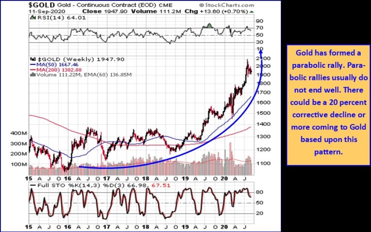 Gold is inside a long-term Bull market. But recently, gold has formed a Parabolic rise. The problem for gold bugs is Parabolic rallies usually do not end well. The Parabolic rise has paused by forming a Triangle pattern. With gold down almost 10 percent, more could be coming over the short-run. It depends upon one of two possible outcomes from the conclusion of this triangle.