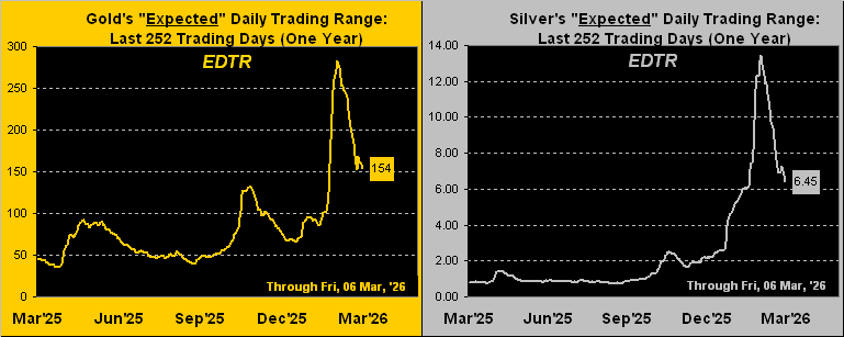 That cited, the expected daily trading ranges for the precious metals have in fact continued to compress; (ref –> Gold Update No. 848 of this past 14 February: “Gold’s Range Compresses as the Uptrend Regresses“). Below we’ve such “EDTRs” from one year ago-to-date for Gold on the left and for Silver on the right. (We hasten to remind you WestPalmBeachers down there that this is not direction of price; rather ’tis expected range of price from one trading day to the next). Such narrowing noted, these EDTRs remain well above historical norms: