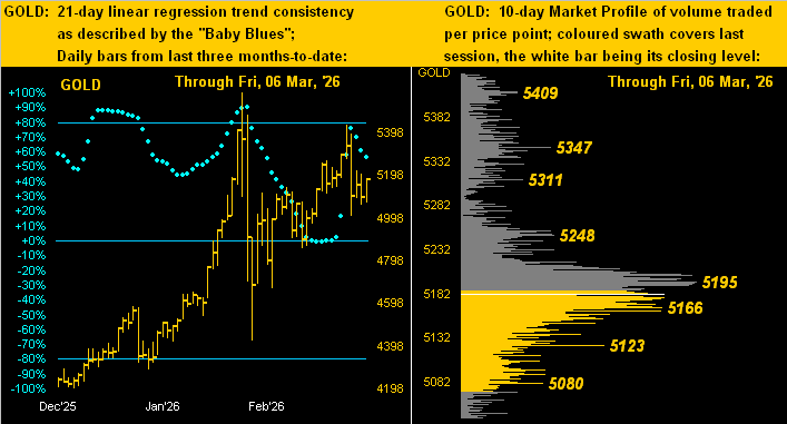 Looking to Gold’s near-term ways, here next are our displays of price’s daily bars from three months ago-to-date at left and 10-day market Profile at right. The baby blue dots of regression trend consistency survived that recent test of the 0% axis upon such slant only briefly having rotated to negative. Then came the prior week’s bounce followed by last week’s trounce. To be sure: “Follow the blues instead of the news, else lose yer shoes”, even as the ride of late has been a bit erratic. Note in the Profile that Gold’s present price of 5181 is just below the most volume-dominant resistor as labeled at 5195: