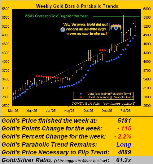 As for Gold’s week just past, ’tis the rightmost bar as we turn to the weekly bars and dotted parabolic trends from a year ago-to-date. And following this new war’s commencement, we heard there was speculation of Gold having made a record high (i.e. above 5586) which clearly didn’t occur. Still, despite Gold’s down week, the blue-dotted parabolic Long trend printed its 13th dot, the flip-to-Short level having risen for the ensuing week to 4889. That is -292 points below the present price of 5181, which technically however is reachable given Gold’s expected weekly trading range is now 318 points: