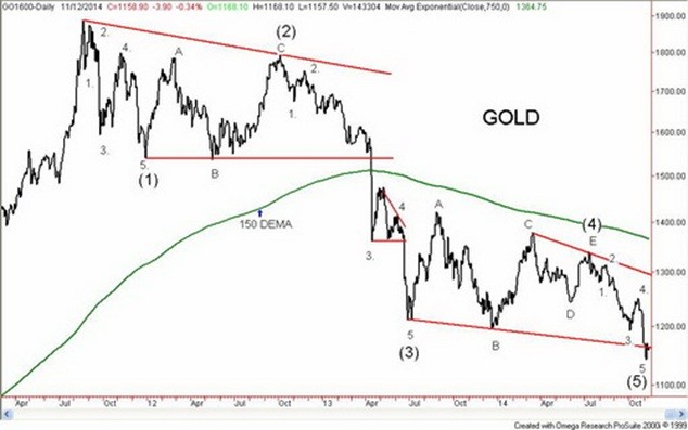 One piece of circumstantial evidence comes from Elliot Wave analysis and has been noted by The Elliot Wave Theorist www.elliotwave.com. Gold may have completed what appears as five wave down structure from the high of July 11, 2014 at $1,340. While gold broke down from what appeared, as a potential triple bottom with potential objectives down to $950, minimum objectives were around $1,130. The low thus far (futures) was made at $1,133 on November 7, 2014. If that low were taken out, then in all probability, the low is not yet in and the $950 objective would loom again. In between potential objectives would be seen at $1,060 and $1,000 with interim support at around $1,100.