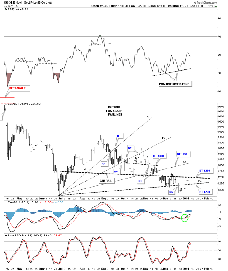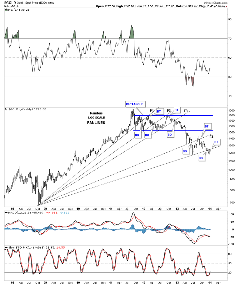The gold fanlines. As you can see gold is now trading above fanline #4 and below the heavy black dashed support and resistance rail or neckline. The price action is moving out toward the apex of the two rails with the bottom fanline #4 at 1220 and the heavy black dashed S&R rail which comes in around the 1250 area. There is now just 30 points that separate these two trendlines. We could witness some violent moves within the apex until one side wins out.