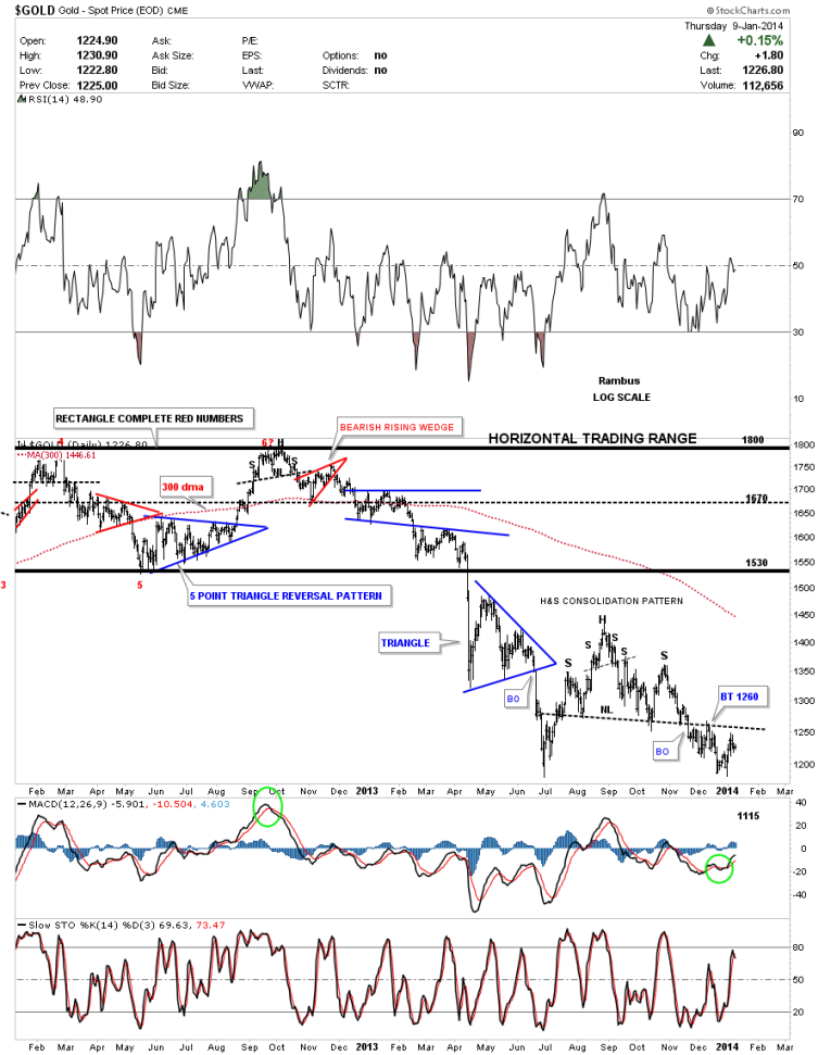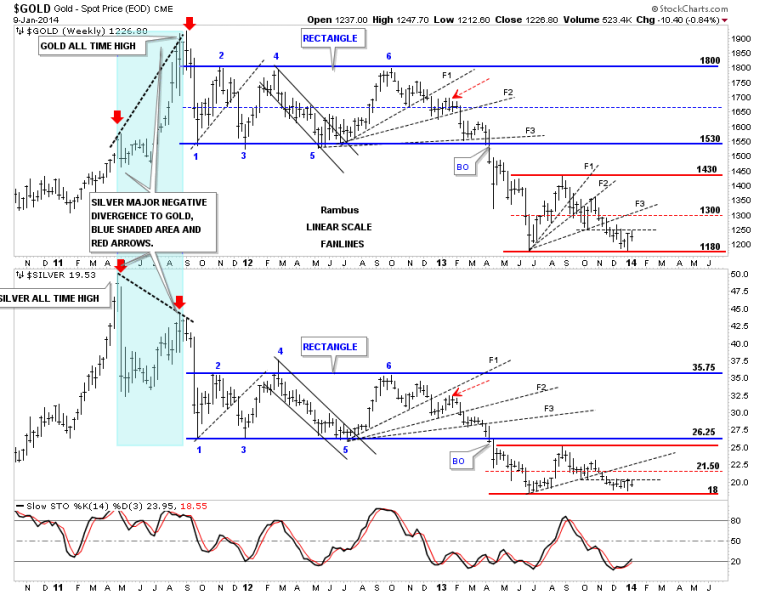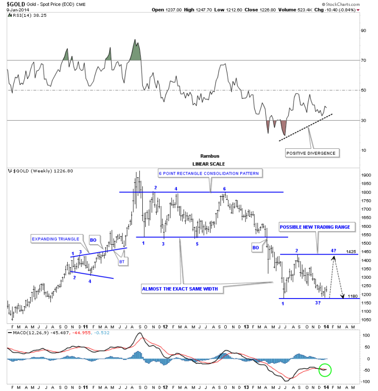 This weekly chart for gold really shows you the possible trading range between 1180 and 1425 or so. As you can see by looking at the 6 point blue rectangle, that was the first consolidation pattern to form during this bear market, it had 6 reversal points. As we know there are no rules to say our current possible trading range can’t have 6 reversal points. Or, if we get a rally back up to the top of the trading range at 1425 and have another decline back to the bottom at 1180 or so, which could then start a 5th reversal point which would then make this trading range a possible 5 point rectangle reversal pattern to the upside, if the price action can takeout the top rail at 1425. That’s just speculation right now but it’s a remote possibility in a bullish scenario.