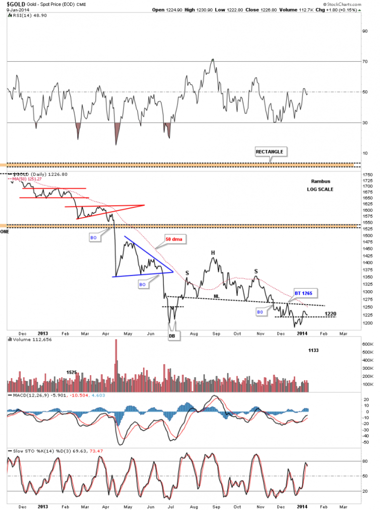 Gold H&S consolidation pattern. This next chart shows the H&S consolidation pattern that we’ve been following since November before it broke below the neckline. As you can see gold has had one complete backtest so far and is attempting another that will come in around the 1250 area.