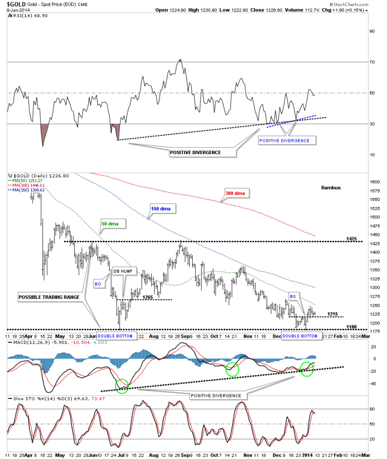 The longer term daily look at gold shows how important this potential double bottom is for an intermediate term rally back up to the top of the possible trading range at 1425.This would be the 3rd reversal point right here with a 4th somewhere higher. The price action doesn’t have to rally all the way to the 1425 area. Gold could put in a lower high and create a descending triangle consolidation pattern somewhere along the way.