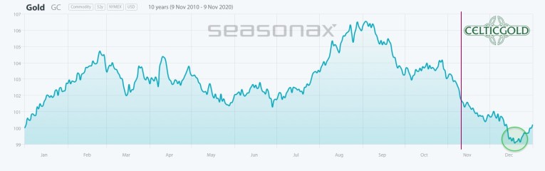 Seasonality for Gold in US Election Years as of November 9th, 2020. Source: Seasonax