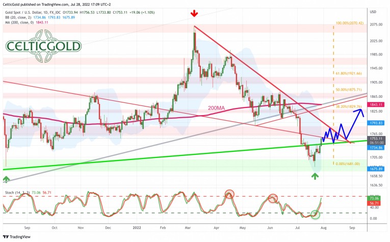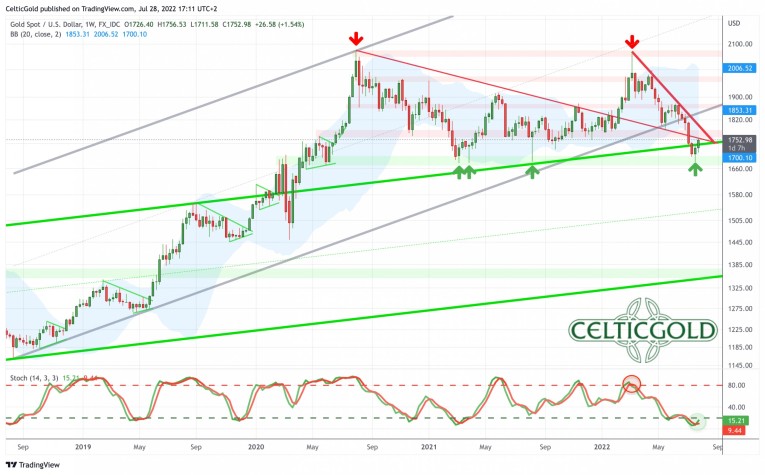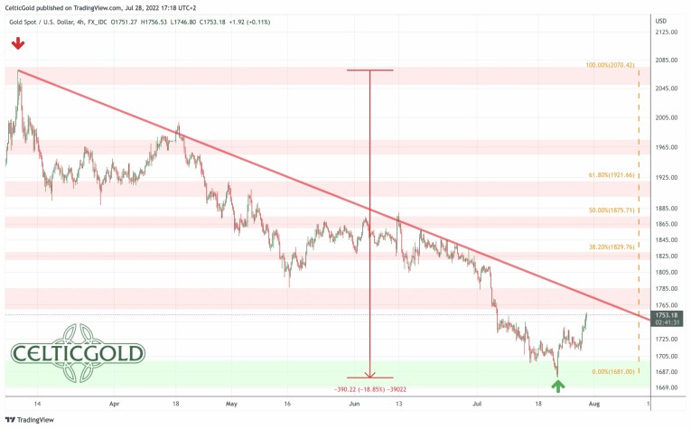 Gold prices reached an important high on March 8th, 2022, at around 2,070 USD and have since then slid into a brutal sell-off over the course of the last three and a half months. The final low of this wave down has been seen on Thursday, 21st of July, at 1,681 USD. Thus, gold has lost almost 400 USD or 18.8% in a rather short period of time.