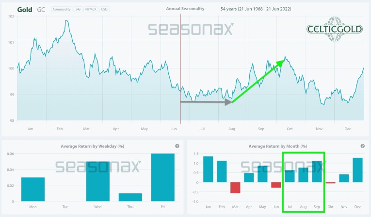 From a seasonal perspective, gold is about to begin its typical summer rally, which statistically has usually caused precious metal prices to rise sharply in August and September over the past 54 years.