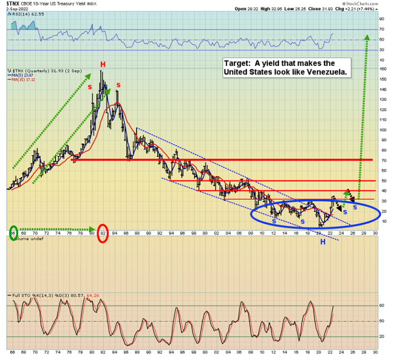 The disturbing US Treasury yield chart. A base pattern is in play. The basing is likely to be completed in several years, perhaps with high right shoulders in the inverse H&S pattern.