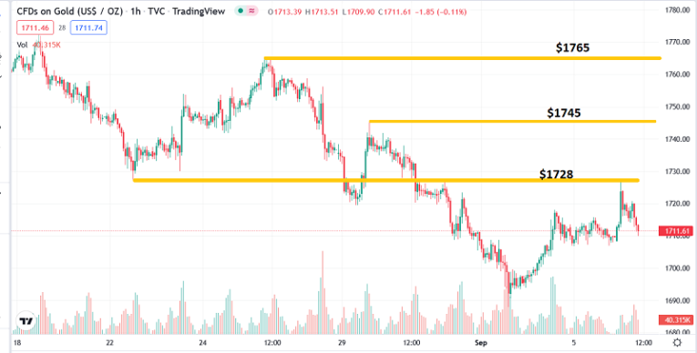 Gold? The hourly chart. In the short-term, $1728, $1745, and $1765 are repelling the rallies. A close above $1728 would suggest the short-term trend has turned up.