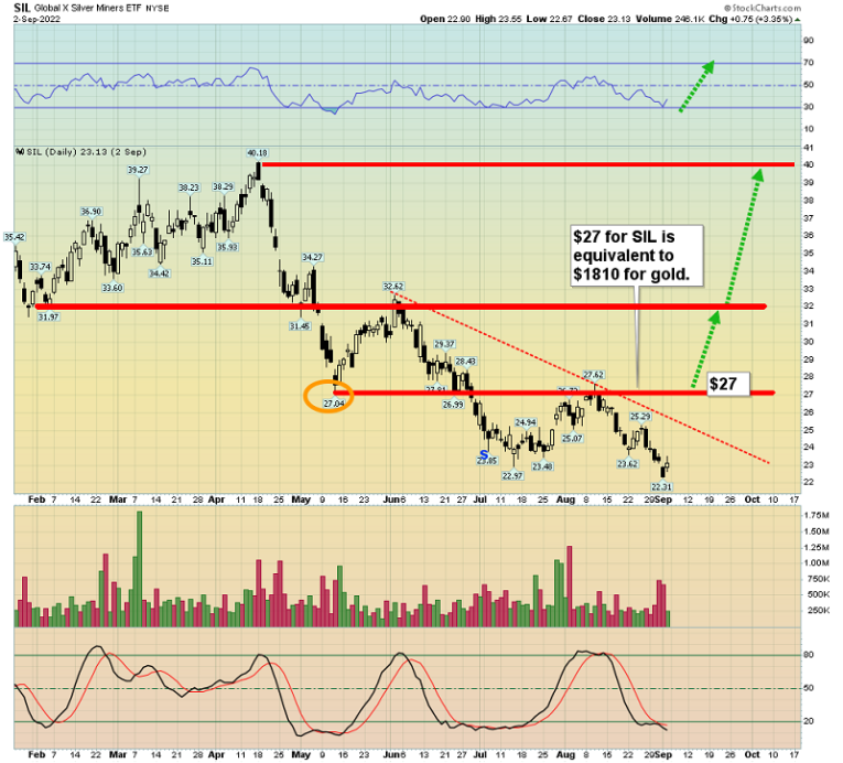 The SIL chart. A move above $27 is likely, should coincide with a move above $1810 for gold, and at that point the prices of $32 and $40 become realistic targets for eager investors!