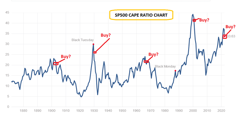 Well, it doesn’t look good there either. The incredibly disturbing SP500 CAPE ratio chart. The “buy the dip” mantra works fairly well, but only when the ratio is 20 or lower, and only if stoplosses are used.