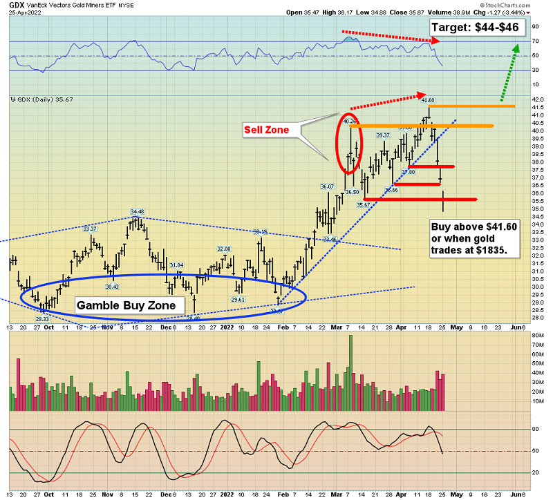 This is a great time to cover “against the box” short positions but it’s not quite time to buy. The big entry point for the miners comes near a gold price of $1835 or on a breakout above $41.60 for GDX and $2080 for gold!