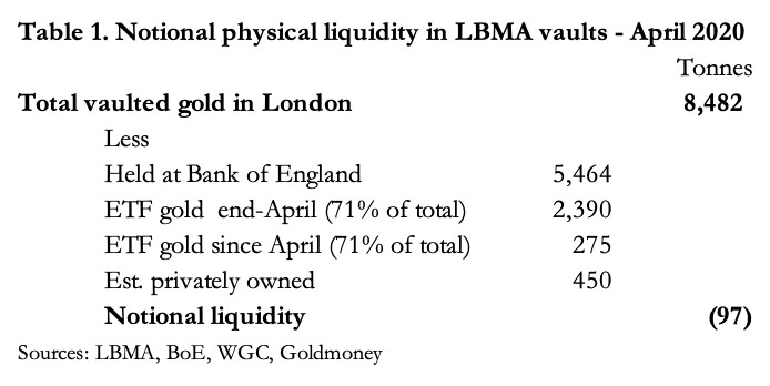 While admittedly simplistic, these figures show that there is no liquidity in London. According to the World Gold Council, total ETF physical holdings at end-April were 3,364 tonnes, of which, according to Paul Mylchreest’s Hardman report, over 70% is vaulted in London, or 2,390 tonnes in Table 1. To this figure must be added gold privately vaulted by sovereign wealth funds, institutions, family offices and agglomerating businesses on behalf of retail customers. These bullion stocks are held with the vaulting companies (Brinks, G4S, Loomis and Malca-Amit), and are likely to amount to a further 400-500 tonnes.