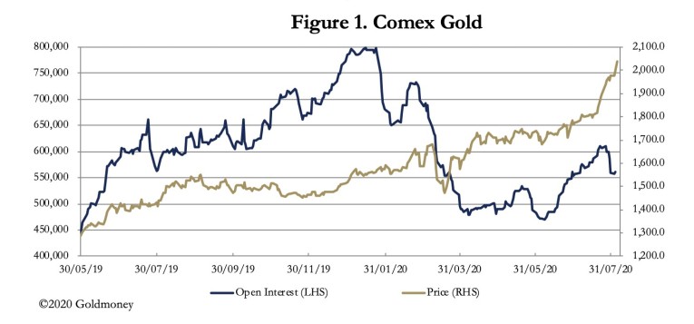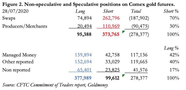 In the increasingly likely event that fiat currencies will lose all function as money, measured in them the gold price will trend to infinity. It is now difficult to see how the dollar can avoid this outcome, or something close to it. That being the case, in this context a price move for gold above $2000 per ounce is an insignificant event, except for those trapped with short positions, which brings us to the chaos on the Comex futures market. Figure 2 shows the position in US gold futures markets on 28 July (the last Commitment of Traders information available) with the spread positions removed.