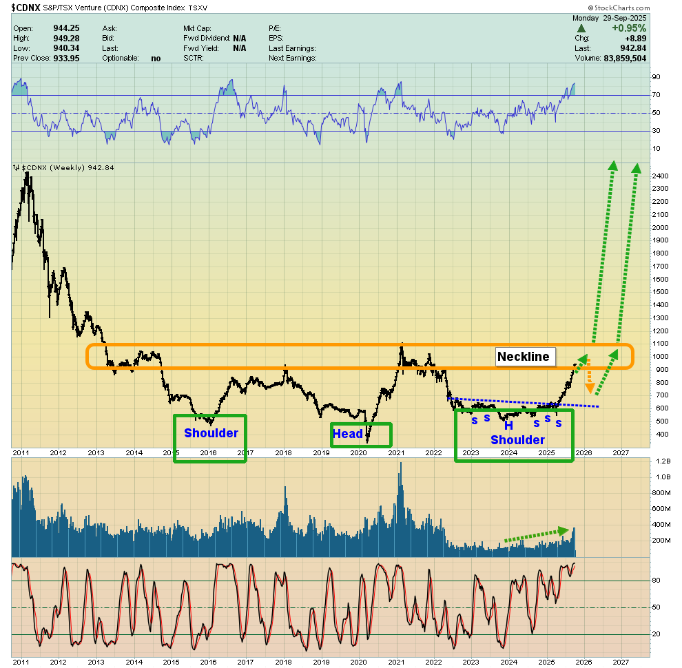 This is the stunning GDX versus gold chart. Changes in leadership at Barrick and Newmont aren’t going to end the gold bull era. The shutdown, Gaza peace, and October seasonality do coincide with the price arriving at the neckline zone of this spectacular inverse H&S pattern. A pause is expected, but it’s only a break in what should be decades of gold stock investor fun!