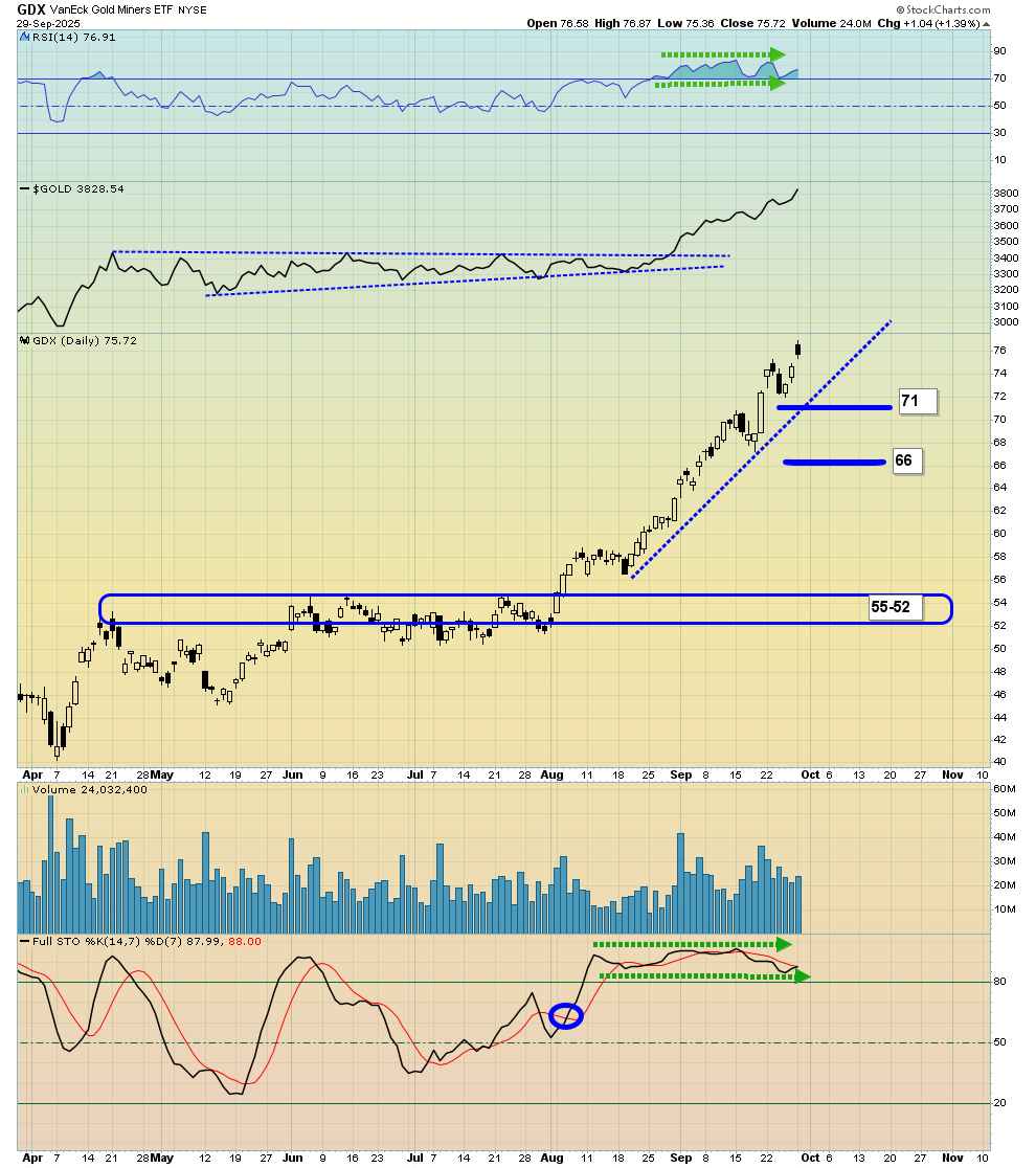 This is the GDX daily chart. For aggressive gold stock bugs who have significant amounts of their net worth in senior miners, I suggest placing stops on part of the position at $71 and $66, basis GDX.