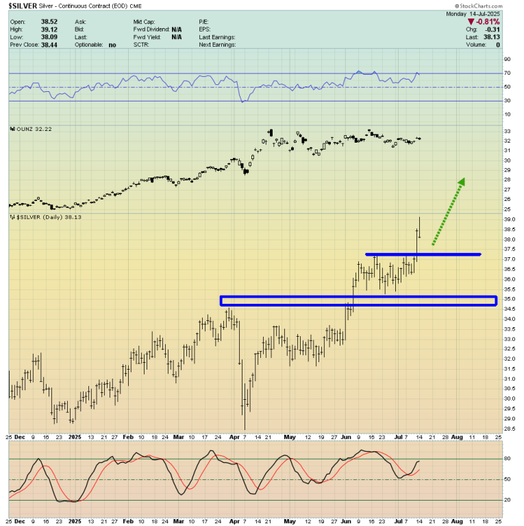 This scenario is in sync with the rollout of the tariff taxes; it’s likely that the brunt of the inflationary pain begins later in the summer, and it could help create quite a spectacular October month finale for the metals and mining stocks rally!