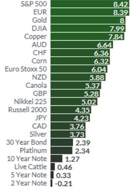 – World stocks (MSCI World) up 10%; gold outperforms Eurostoxx (+6%) & FTSE (+2.3%)