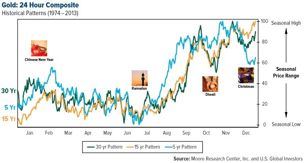 This helps confirm what I often write and speak about, that gold prices have historically followed seasonality trends for the five-, 15- and 30-year periods. You can see how gold troughed between June and July and then rose in anticipation of Diwali and the wedding season.