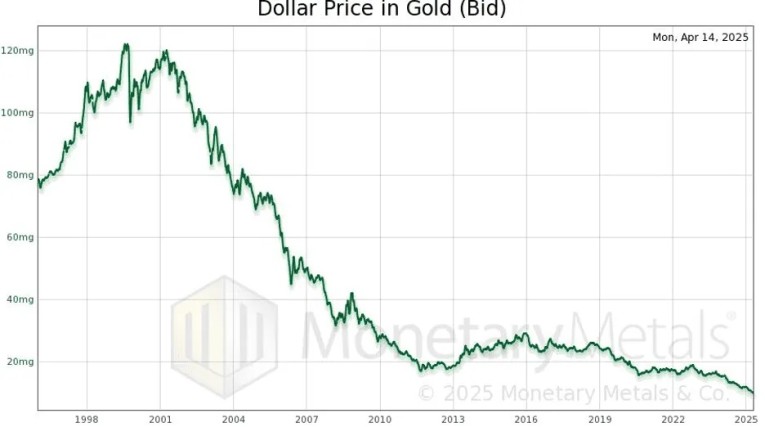 Here’s a graph of the price of the dollar measured in gold since 1996. From over 120 mg of gold per dollar, down to below 10 mg. Where is the limit?
