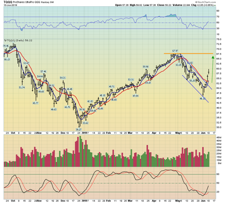 At my https://guswinger.com swing trade service, we are long the stock market via TQQQ. My system is mechanical; I am always either long or short the Nasdaq via TQQQ/SQQQ. I’m also always long or short gold stocks via NUGT/DUST.