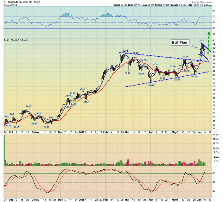 This is the Kirkland Lake chart. My swing trade subscribers and I hold call options on this great company. The stock is trading above its February high while most gold stocks are not. This kind of outperformance is what I look for when considering a call options position.