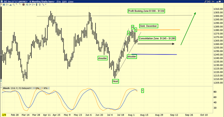 Gold is consolidating the recent rally. That rally (basis December futures) moved the price from the $1210 area up to about $1280.