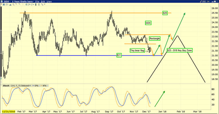 This is the key GDX chart. I’ve outlined the $23 - $18 area as a vital buy zone for gold stock enthusiasts. Within that price area, the $21 and $18 price points are most technically significant. The tiny bear flag in play suggests that investors will get a chance to buy the $21 area before an imminent major gold price rally carries GDX much higher. Investors can join me in placing some larger buy orders at both price points now, to be sure we’re all poised to participate in the ensuing rally time fun!