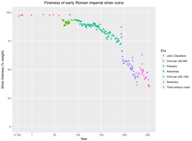Below, is a chart that shows the extent to which the Roman emperors debased their coinage: