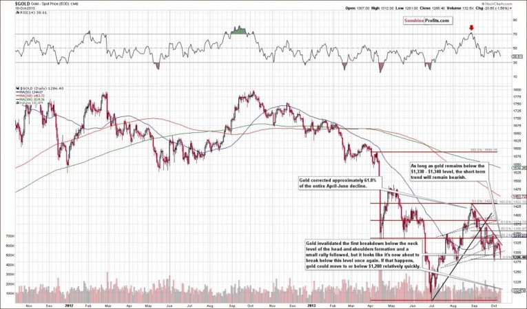 These circumstances present a potential breakthrough in the standoff that has led to 10-day partial U.S. government shutdown. From today’s point of view it seems that thanks to this development the yellow metal lost an important support. Please note that gold is considered as a hedge against political and economic uncertainty by some investors, who purchase the metal when such fears run high and reduce their holdings in favor of riskier assets like equities when these concerns fade. Therefore, yesterday, gold fell and touched a one and a half week low of $1,282 as investors cut back holdings of the haven asset. This is gold's lowest price since the first day of the partial government shutdown. Earlier today, we saw a small pullback to $1,294, however, gold is still heading for a weekly decline. Please note that if the yellow metal closes today below $1,282, it will be its sixth decline in seven weeks, which will extend the year's losses to 23%.