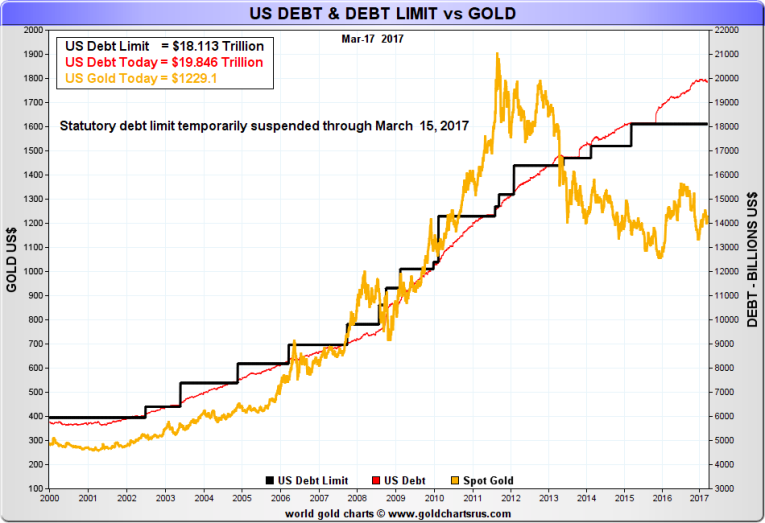 Gold prices have gone up with the debt limit over the years. It may be coincidental but it may also be message that the US$ is backed by nothing more than a promise on the part of the US government to pay the bearer of the note. That is the classic definition of a fiat currency. From 1970 when the world came off the gold standard to around 1990, gold prices for the most part had gone up faster than the debt. During gold’s long bear market the debt started rising faster than gold prices. Gold prices didn’t catch up and rise faster than the debt again until 2011. It was short-lived as by 2012 gold prices were falling even as the debt kept on rising.