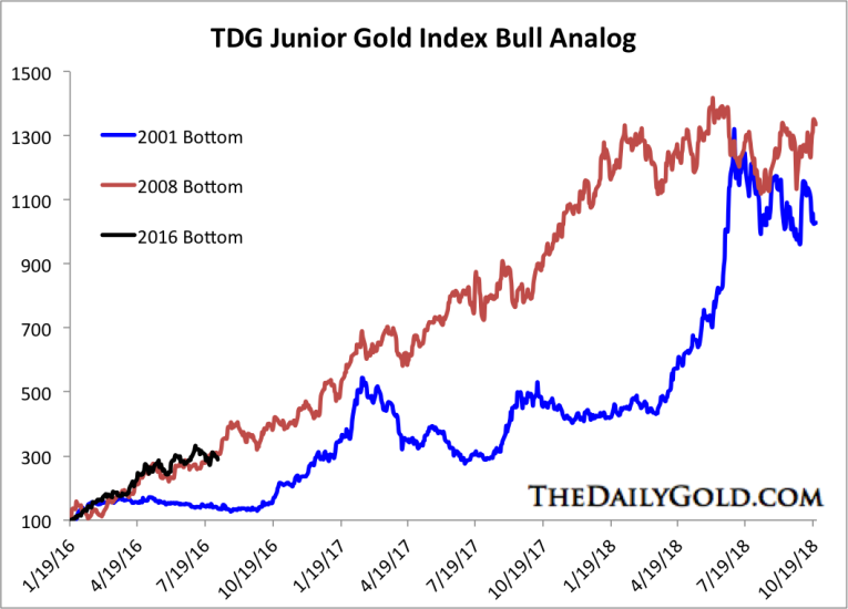 Over the past two weeks the precious metals complex has retested its Brexit breakout and rebounded back to the July highs. Today’s jobs report has pushed the complex lower, but has delivered an opportunity to cash heavy portfolios which have missed the bulk of the move. With that said, we wanted to share our current analog charts for Gold, gold stocks and junior gold stocks which suggest continued upside potential in the sector.