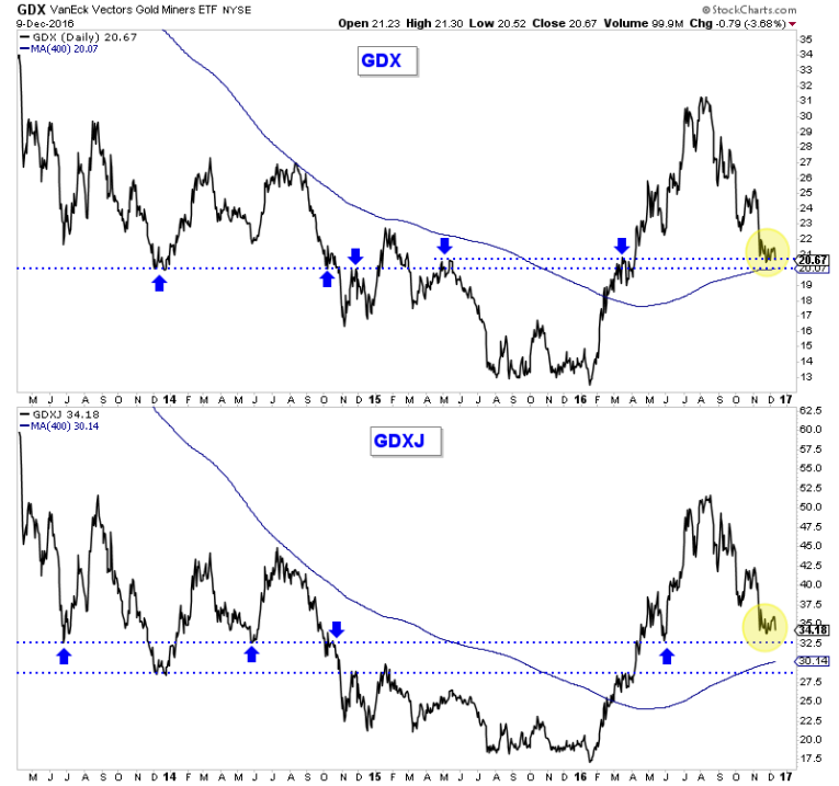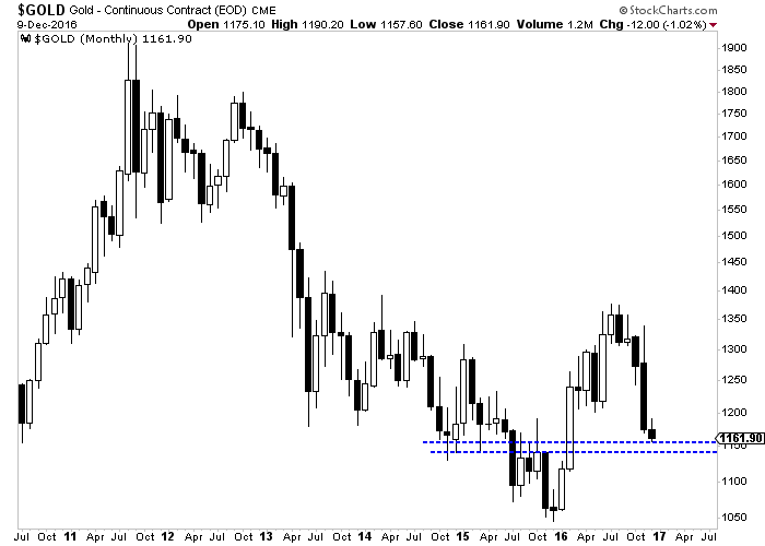 The technicals argue that both gold and gold mining stocks could drop a tiny bit more before starting a rebound. It would not surprise me if the sector is soft into or even immediately after the coming Federal Reserve rate hike. Once that passes, the sector could be in position to rally as expected. The coming strength would be an opportunity for traders and investors to de-risk their portfolios and raise cash for a better buying opportunity early next year. Generally speaking, we do not want to buy investment positions until we see sub $1100 gold and an extreme oversold condition coupled with bearish sentiment.