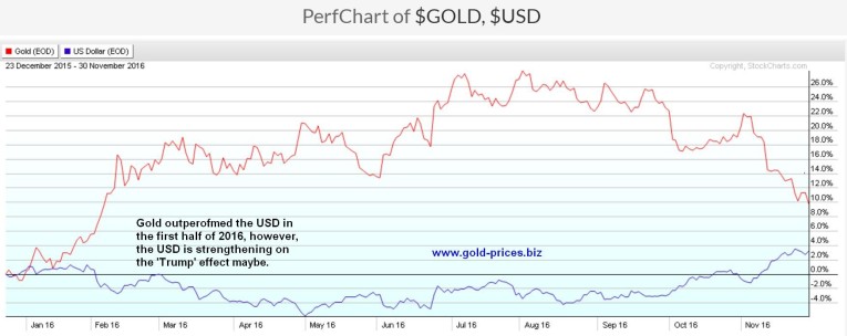 A quick look at the chart below depicts gold has lost some of its differential with the dollar in the latter part of 2016.