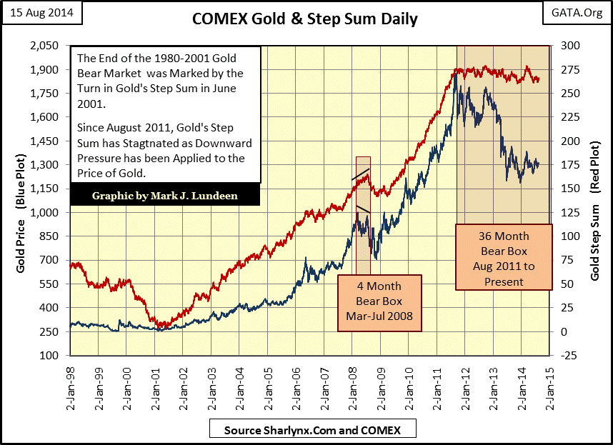 Below is gold’s step sum chart from 1998 to 2014 which provides our bull market a little more detail.  From the summer of 2001 to March 2008 (the beginning of the sub-prime mortgage debacle) the blue price plot and red step sum plot both increased, as expected in a bull market.  But beginning in March 2008, a bear box began forming, where the price of gold declined as its step sum plot continued rising for the next four months.  Remembering that the step sum plot is a market sentiment indicator, we see how from March-June 2008 the gold bulls refused to believe that the price of gold could go down amidst the turmoil in the global credit markets.   It seems that the gold bulls were unaware that market trends today are matters of “policy directives”, and “official policy” for gold during a credit crisis was for it to go down.  This time it didn’t take eight years for the bulls to figure it out; in June 2008 the red step sum plot fell in line with the bearish blue price plot.  The price of gold bottomed on 23 October 2008 with the step sum bottoming a month later on 18 November 2008, signaling the start of the next phase of the bull market.