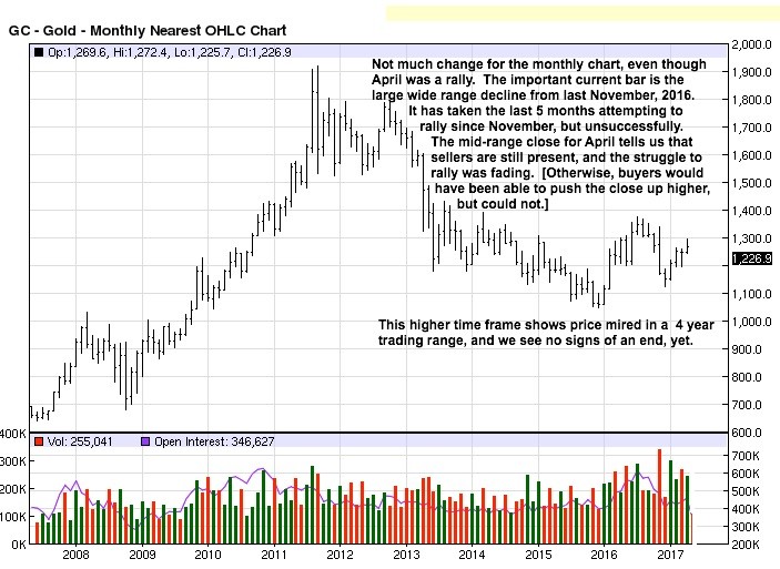 Monthly chart comments cover what is going on, which is not much in the way of any change. Sideways markets can last for incredibly long periods of time, this one now in its fourth year. The current ennui characterizing gold has to be accepted for those long the physical. While no change to the upside appears imminent, we are dealing in markets of perception [with no sound basis in reality]. Perceptions can change quickly, and all bets are off. This is what we think can happen in gold. One day, or over one weekend, price all of a sudden takes off with little respite to the upside.