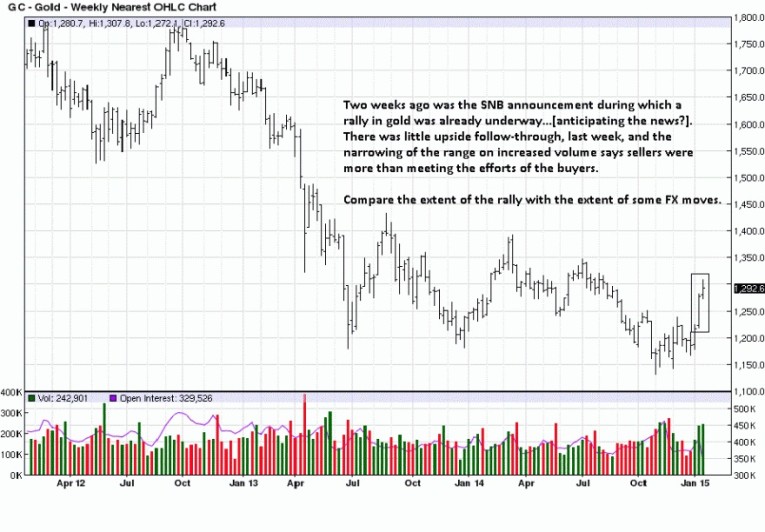 There has been some discussion about how the Swiss National Bank breakaway from the 1.20 peg to the Euro was a shot to the upside for gold. It appeared to us that the rally may have been sparked a few days ahead of the announcement, and last week’s mostly sideways aftermath was the froth on the rally. It may continue, but the narrower range could just as well lead to a pullback, discussed in last article, Timing Is The Most Important Element, [paragraph above each weekly chart of silver and gold].