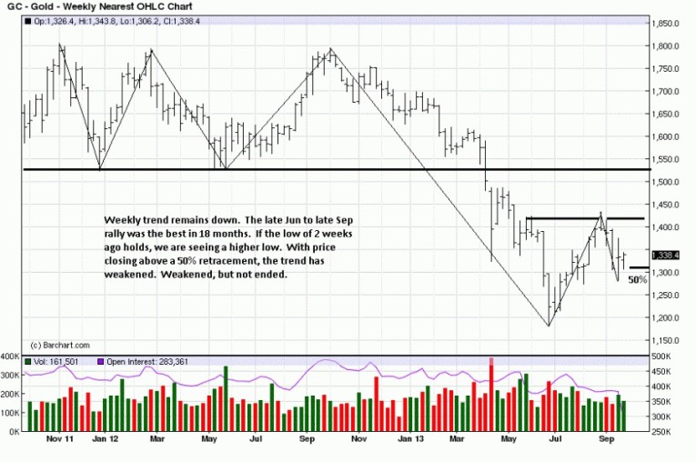 The same information is seen in greater detail on the daily. The effort to push price lower from six weeks ago was stopped, but the rally effort since has been somewhat weak. Gold needs to rally away from this little support area, or it could be challenged, again.
