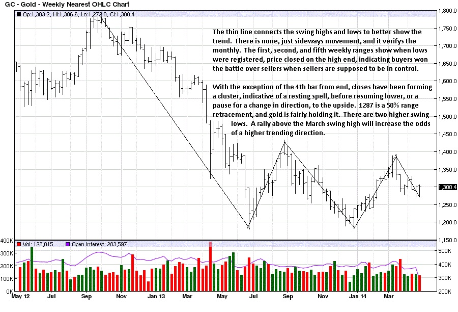 It is easier to see the sideways movement from the thin line connecting the swing highs and swing lows. Price needs to rally above the 1390 area to turn the near term trend up.