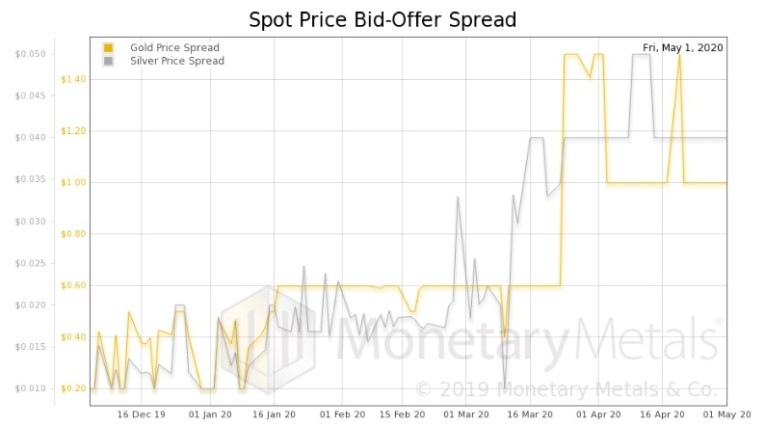 Below is a graph of the spot price bid-offer spread in both gold and silver. Notice that, since April 3, the spread in gold is down significantly from its high (with one spike), though not back to its pre-2020 normal. Silver appears to have rolled over, but at $0.04 its bid-ask spread is still quite elevated.