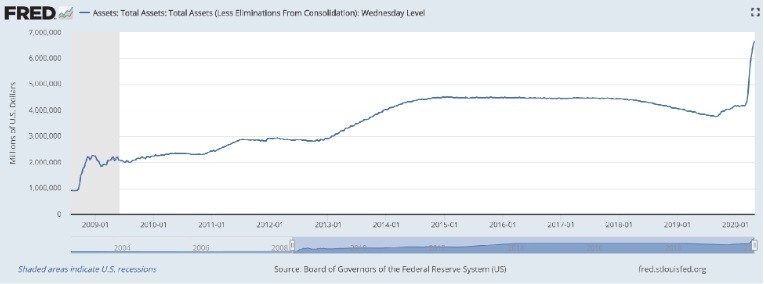 We think it means that the Fed’s massive asset-buying program has had its intended effect (it will have a number of other effects, as well). The Fed has bought about $2.5 trillion worth of bonds, which has grown its balance sheet by 60%. This is the stuff of madness. See the graph of the Fed’s assets below.