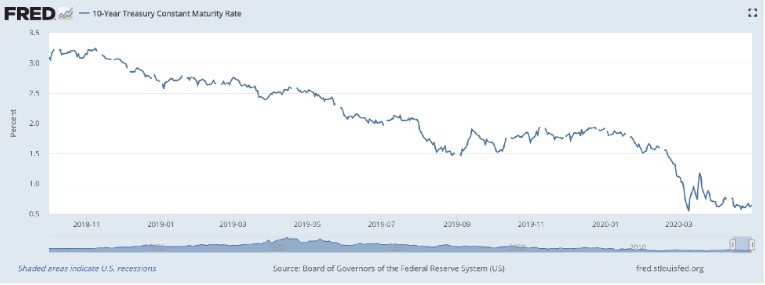The other reason is that the interest rate has collapsed. In Fall of 2018, the interest rate on the 10-year Treasury bond was 3.2%. As recently as January, that interest rate was 1.9%. But, by March 9, it had fallen to 0.5%, and since then has been bouncing along the floor. See the graph of Treasury yields below.