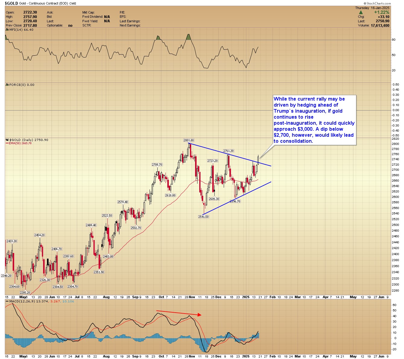 With U.S. markets closed on Monday, January 20th, for Martin Luther King Jr. Day and Trump's inauguration, traders are positioning themselves ahead of the long weekend. Gold is experiencing a rally as investors hedge against potential market fluctuations.