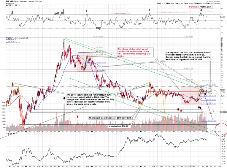 In short, it doesn’t seem very likely, even though both situations do indeed share some similarities. One similarity for instance is that the overall medium-term outlook didn’t really improve despite higher gold and silver prices. Why? For instance, because none of the long-term points that we made in our previous analyses, were invalidated based on gold and silver moving higher since July. Most importantly, the long-term outlook for the USD Index and the way gold is likely to react to USD’s big upswing, remain unchanged.