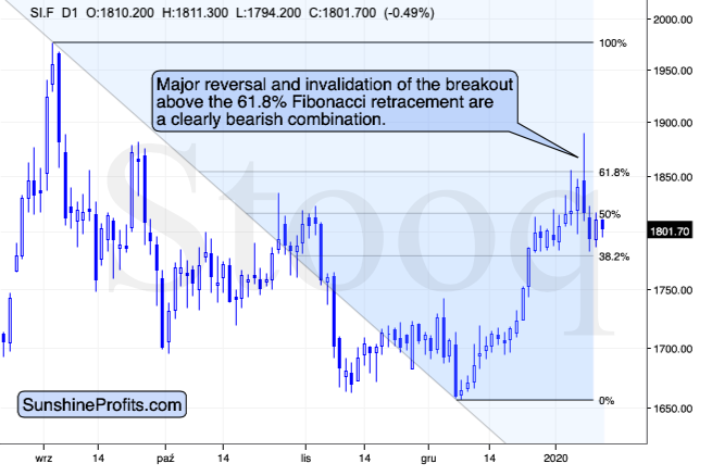 On a short-term basis, we see that silver tried to move above the 61.8% Fibonacci retracement based on the most recent decline and at the same time, it moved just a little above the 61.8% Fibonacci retracement that you can see on the previous long-term chart. Taking the 2016 top as the starting point and the 2018 low as the ending point, we get $18.45 as the retracement. Silver had moved less than 10 cents above it and then it invalidated this tiny breakout. Then it invalidated the more short-term breakout as well (the one that you see on the above chart).