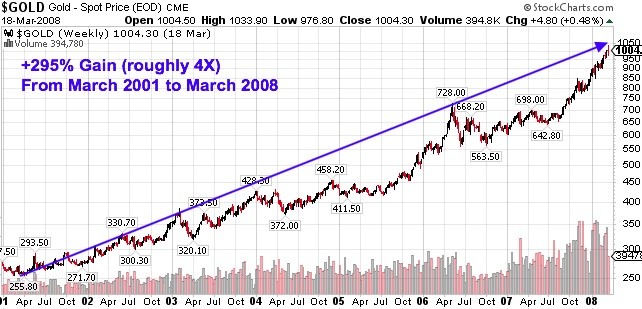 If gold did indeed bottom around $1,050, this new bull market trend is only getting started. The rally that followed the 2001 low generated returns of around 295% for gold. It advanced roughly 4X from $255 in March of 2001 to over $1,000 in March of 2008!