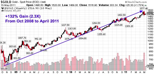 The rally that followed the 2008 financial crisis generated returns of 132% for gold in under three years. The gold price more than doubled from the low of $681 in October of 2008 to a high around $1,577 in April of 2011.