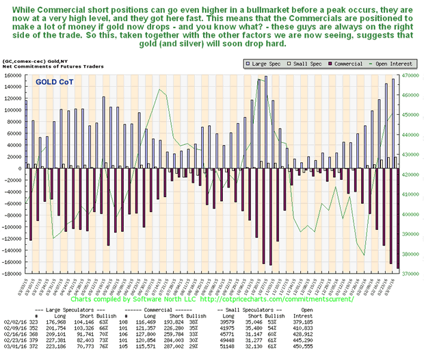 The latest gold COTs are a disaster with Commercial shorts, which were already high a week ago having piled up even more, and since this data is for Tuesday night's close, you can bet that they went even higher on Thursday's advance to new highs. Now, I've heard the justification that they reach higher peaks in a bullmarket uptrend, but even so, taking the other factors detailed here into account, this looks bad - and it won't be the Commercials on the losing side if gold if now proceeds to drop.